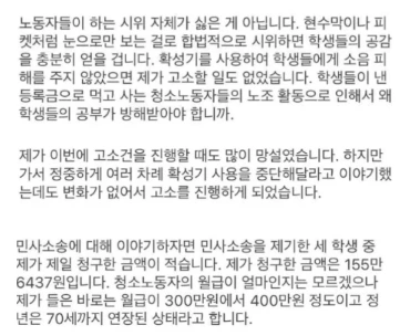 그분들은 '자신들의 노동'으로 먹고사는 것이지, 학생들이 낸 등록금으로 먹고사는 것이 아닌 것을 왜 모를까요? 마치 자신의 등록금이 그대로 그분들의 계좌로 이체되는 것처럼 생각하고 있는 것 같아요. 노조 활동의 방법을 비판할 수 있지만, 청소 노동자들을 학생들이 먹여살린다는 고대 유물 같은 생각은 정말 걱정됩니다.