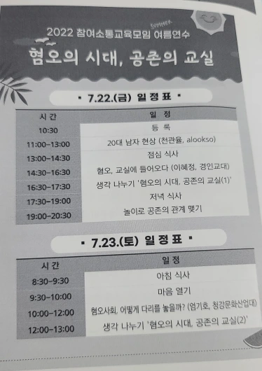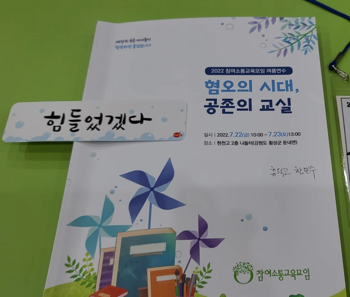 여름방학을 하고 이틀간 집에서 먹고 자고 놀고 자며 '나 혼자 산다'를 찍다가, 사흘째 되던 날 이불을 박차고 홀연히 집을 나서 1박2일 연수를 다녀왔어요. 코로나 이후 2년 반만에 <참여소통교육모임>의 숙박연수에 참여한 것이지요. 그립던 선생님을 만나 회포를 풀었던 것도 즐거웠고, 연수 주제와 강의 모두가 훌륭했습니다.
