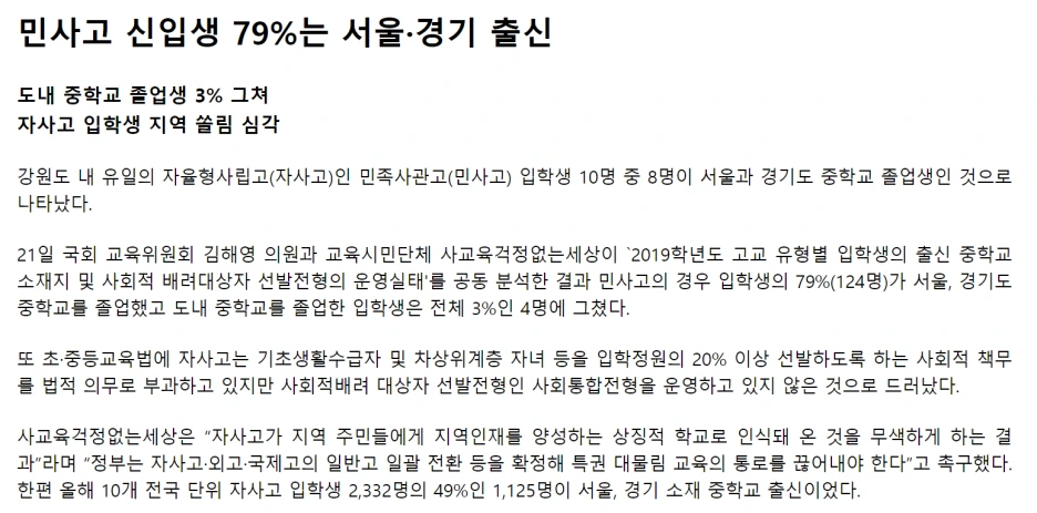 자신의 자녀가 학교 폭력으로부터 안전한 '그들만의 학교'로 보내면 되는 것이다. 거칠고, 위험한 아이들을 아예 만날 일이 없는 그들만의 학교 말이다. 그런데, 실사판 <더 글로리>의 배경이 된 민사고의 경우는 강원도를 출신 학생이 단 3%라고 한다. 사회통합 전형도 운영하지 않는, 귀족학교가 된 것이다.