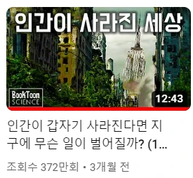 '북툰 사이언스'라는 과학 유튜브에서 <인간이 사라진다면 지구에 무슨 일이 벌어질까?>라는 영상이 며칠간 위성처럼 머릿속을 날아다녔다. (의외로 자연과학에도 관심이 많다는 ^^;) 현재의 지구 위의 모든 것은 그대로 있는데, 인간만이 갑자기 사라진다는 상상을 눈앞의 현실로 보여준다.