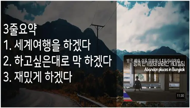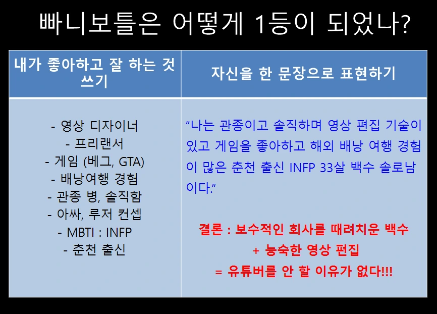 이것만으로 동기부여가 부족할 수 있어서, 구독자 178만 명에 빛나는 우리나라 1등 여행 유튜버 '빠니보틀'을 예시로 만들었다. 2019년 초에 33살의 나이로 회사를 그만두고 세계 여행을 시작한 그는 6개월 만에 구독자 1만 명이 넘었고, 코로나19로 인해 구독자 수가 급증해서 현재에 이르렀다.