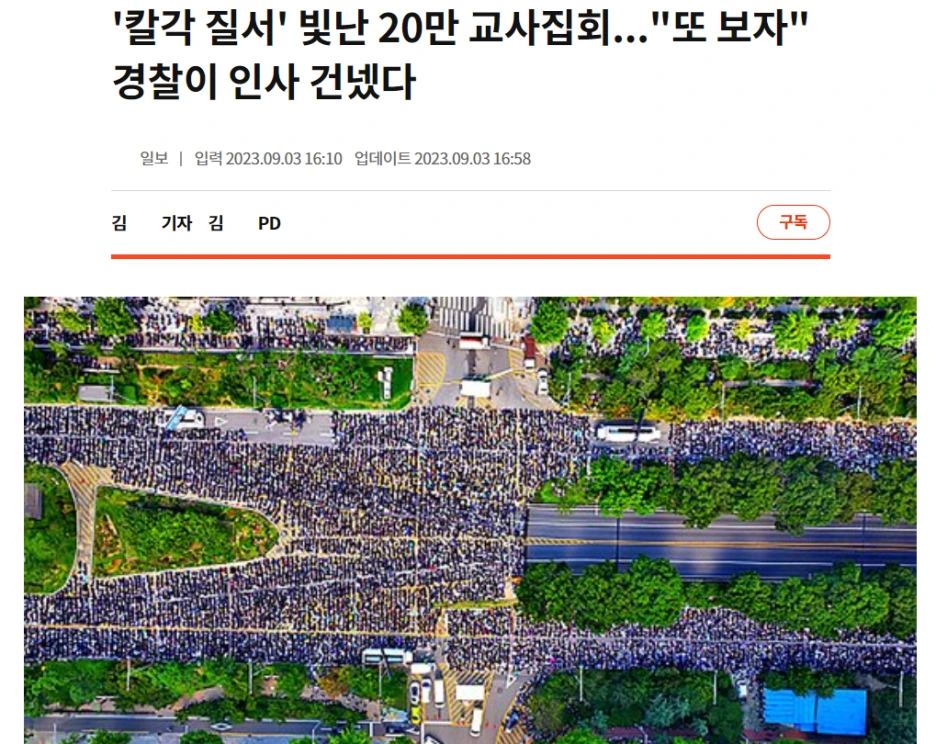 9월 2일, 여의도 국회 의사당 앞에서 열린 50만 교사 총궐기 대회는 사진에서 보듯 '칼각 질서'도 화제이다. 자체적으로 질서 유지 인원을 선발해서 통제하면서 자리에 앉게 하고, 주위의 경찰들과 소통하면서 협력했다. 제자일 수도 있는 경찰관과 얼음물을 나눠 마시며 격려했고, 쓰레기 한 점 남기지 않고 집회를 마무리했다.