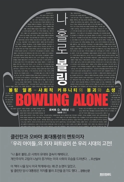 하버드대 교수인 로버트 퍼트넘의 『나 홀로 볼링』에 관한 이야기를 유튜브 채널 매불쇼에서 듣고 관심이 생겨서 관련 내용을 더 찾아 읽게 되었다. 책 제목처럼 1960년대 후반 이후 미국에서는 볼링마저도 혼자 치는 사람이 등장했다고 한다. 이 현상이 상징하는 것은 '사람들 사이의 협력을 만드는 제도, 규범, 네트워크, 신뢰 등 모든 것'을 뜻하는 사회적 자본의 감소이다.