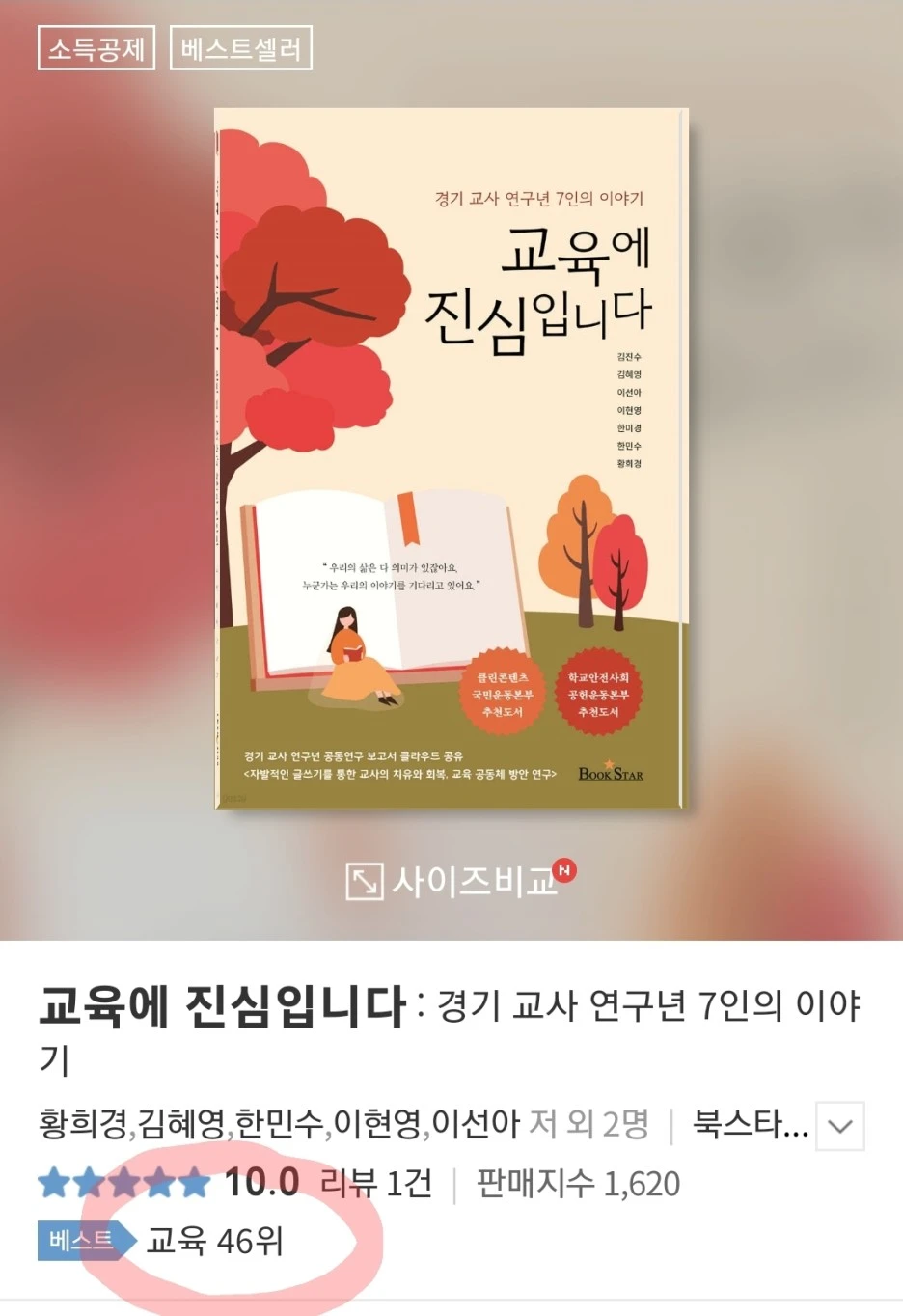 * 추신 : <교육에 진심입니다>가 아직 예약 판매 중이지만, YES24에서 사회·정치, 교육 부문에서 베스트셀러 46위가 되었습니다. 사회·정치 전체에서는 127위이고요. 바로 위에 있는 책이 무려 <소유의 종말>, <문명의 충돌>이라니 놀랐습니다. 앞으로 며칠뿐이겠지만, 달콤한 꿈을 더 꾸고 싶습니다. 감사합니다.^^