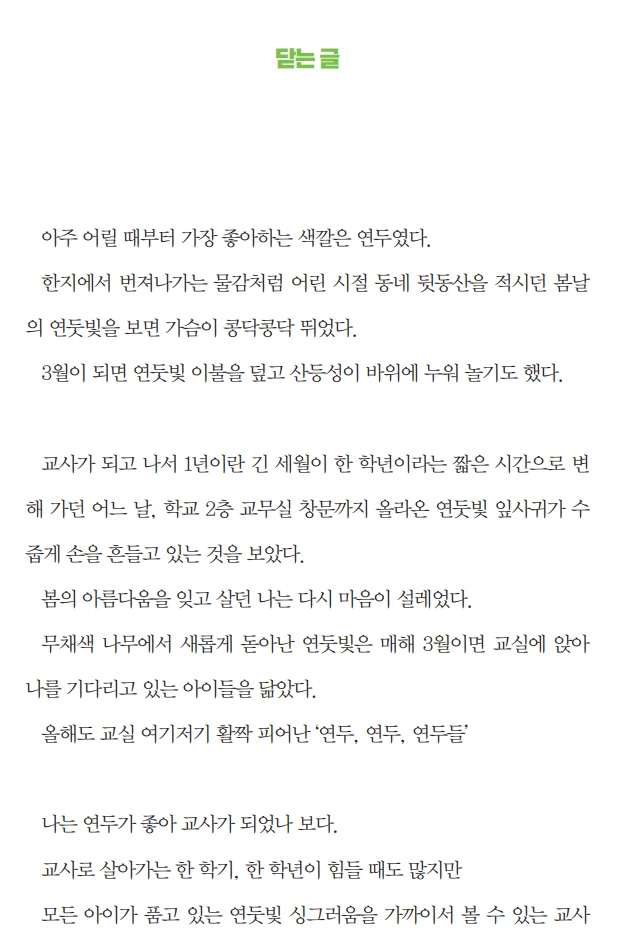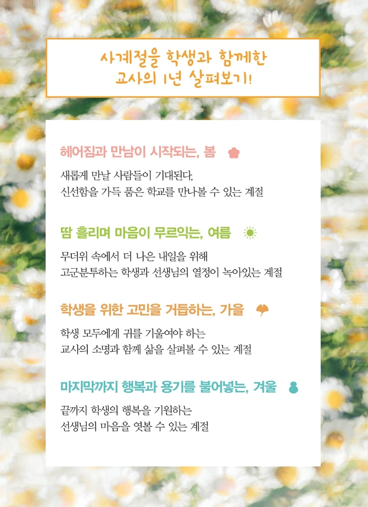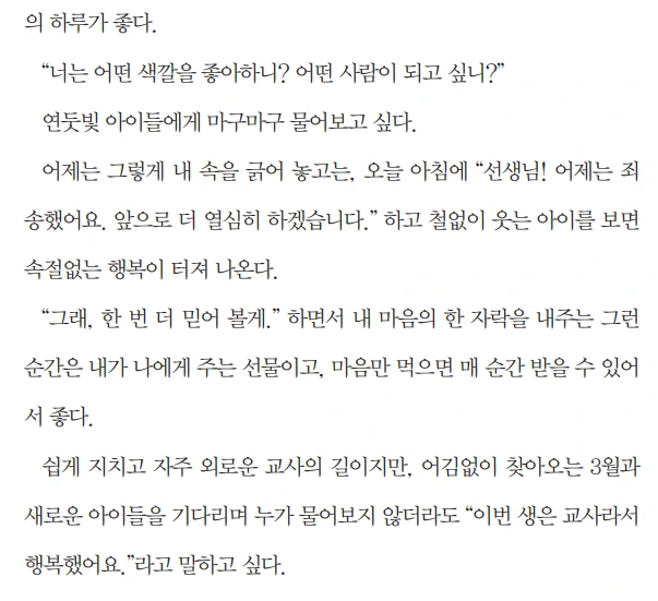 내일 <이번 생은 교사로 행복하게>가 정식 출간되어 소식 전합니다. 예스24, 알라딘 등 온라인 서점에 들어갔더니, 책 소개 페이지가 업데이트되었고 미리 보기도 가능하게 되었더군요. 궁금하시면 앞부분 일부를 미리 읽어보실 수 있답니다. 제 생각엔 뒤로 갈수록 내용이 더 좋아지는 것 같지만요.^^;
