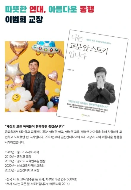 당시 흥덕고의 교사와 학생들은 교장 선생님을 '범희샘~'이라고 불렀다. 2010년 <학교란 무엇인가>라는 EBS 다큐에서 봤던 그 모습 그대로였다. 매일 아침 등교 맞이를 하며 아이들을 섬세하게 보살펴 주었고, 힘든 기색이 보이는 교사에겐 따뜻한 차 한 잔을 내주셨다.