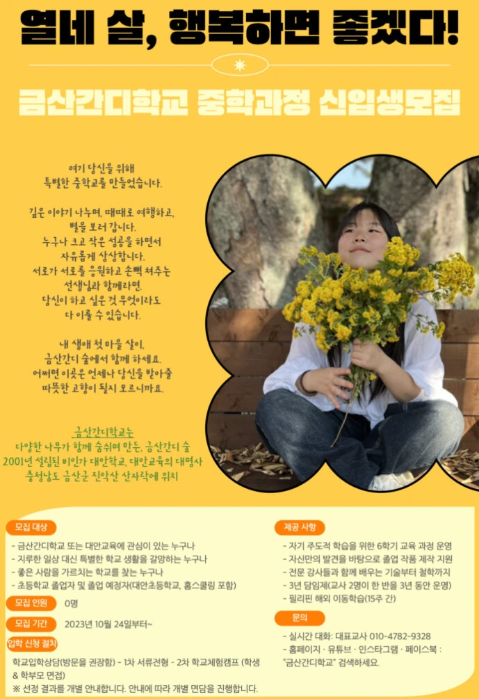 학교를 둘러보며 느낀 소감은 아래의 6행시로 대신하고, 한 마디만 덧붙이고 싶다. 금산 간디학교의 중학 과정은 아직 신입생을 모집 중이라고 한다. 대안교육에 관심 있는 분들이라면, 금산 간디학교의 홈페이지를 둘러보며 관심을 가져주시면 좋을 것 같다.^^
