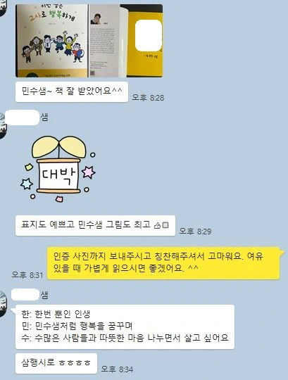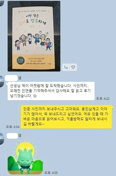 공동 저서를 내면서 6명의 다정한 벗이 새로 생겼다면, 개인 저서인 <이번 생을 교사로 행복하게>를 출간하고 나서는 옛 동료에게 안부를 전할 수 있어서 참 좋았습니다. 흥덕고와 용인삼계고, 그리고 배움의공동체연구회와 참여소통교육모임에서 추억을 함께 만들었던 선생님들 몇 분께 출간 소식을 전하면서 책을 보내드렸습니다.