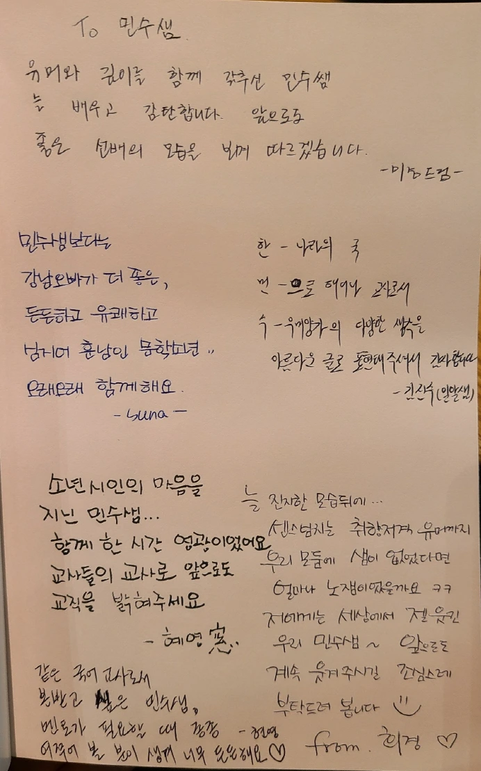 <이번 생은 교사로 행복하게>를 구매해서 읽어주신 분이, '민수샘의 장이불재' 블로그의 댓글에 '한 줄 소감과 인증 책 사진'을 첨부해서 올려주시면, <이번 생은 교사로 행복하게> 한 권을 원하시는 주소로 보내드립니다. 댓글을 올려주신 순서대로 10분을 선정하겠습니다. 신청 댓글과 함께 책을 받으실 주소와 전화번호, 성함을 비공개 댓글로 남겨 주시면 됩니다.