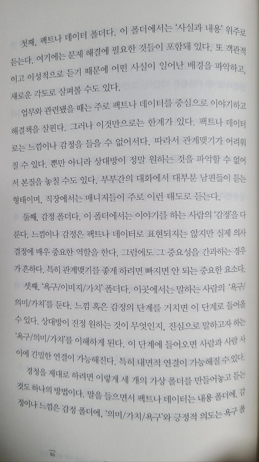 첫째, 수용을 위한 '팩트나 데이터' 폴더다. 이 폴더에서는 '사실과 내용' 위주로 듣는다. 여기에는 문제 해결에 필요한 것들이 포함돼 있다. 또 객관적이고 이성적으로 듣기 때문에 어떤 사실이 일어난 배경을 파악하고, 새로운 각도로 살펴볼 수도 있다.
