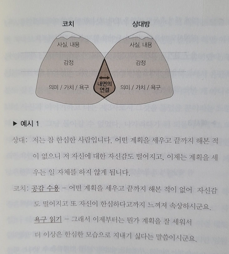 그러나 사실과 내용에 대한 감정까지 물어보고 이해해 주면 점점 가까워지고, 소통이 된다는 느낌이 생긴다. 한 단계 더 나아가 욕구까지 읽어주고 의미와 가치를 공유하면 두 사람의 내면이 연결되는 느낌이 들게 된다고 한다.