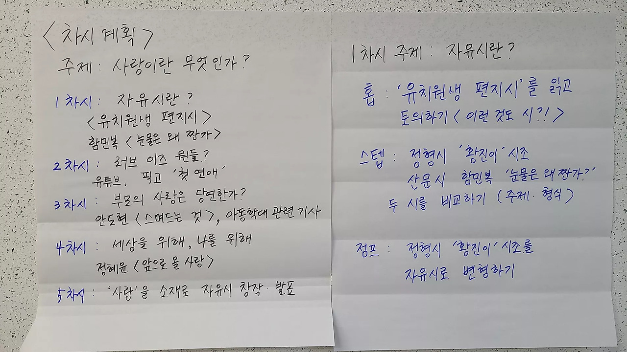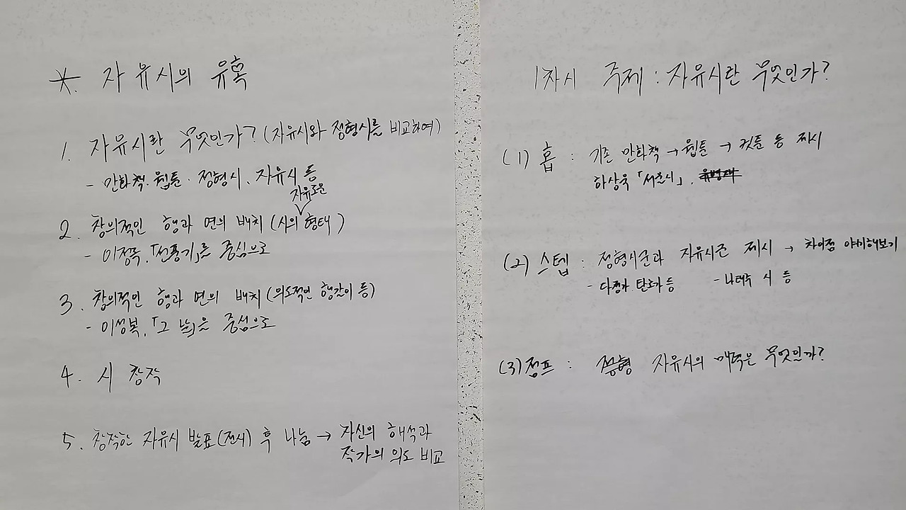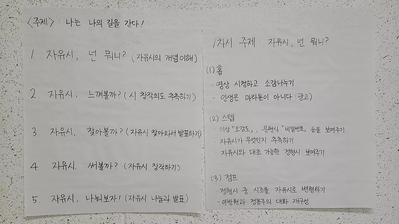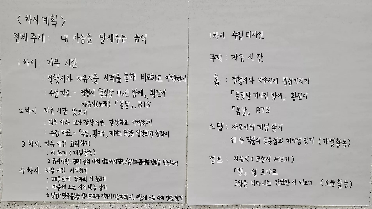 오후에는 교육과정 재구성 실습을 3시간 동안 했습니다. 오전에 말씀드린 배움의공동체 수업 디자인 원리와 저의 수업 사례를 참고해서 멋진 수업을 창조해 보는 시간입니다. 3~4명 한 모둠을 같은 학년을 가르치는 교사로 가정하고, '자유시의 이해와 창작'을 주제로 한 4~5차시 수업을 디자인해 봤습니다. '행과 연의 배치가 창의적인 시'를 창작하게 하는 과정이 어려운 도전임에도 불구하고, 웃음꽃을 피우며 함께 수업을 만드는 선생님들의 모습을 보니, 아빠(?) 미소가 절로 나왔어요. 4개 모둠 모두 개성이 있었고, 수업 자료로 선정한 작품들은 저도 활용하고 싶을 만큼 신선하고 매력적이었습니다.