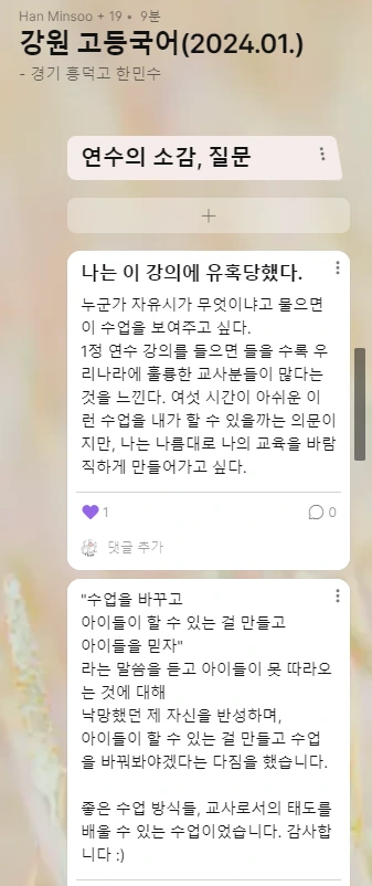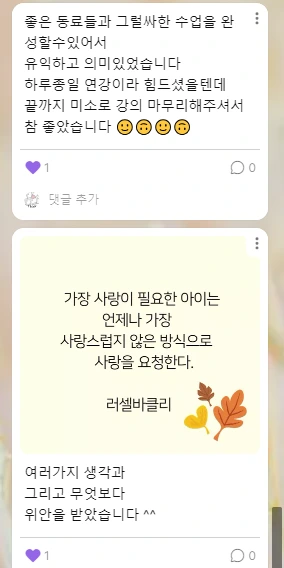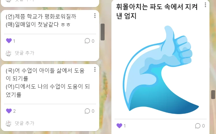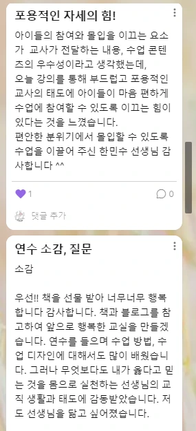 패들렛에 남긴 연수 소감을 읽으면서, 다시 한번 교사로 나이들어 가는 소소한 행복을 느꼈습니다. 학교에서도 후배 교사들과 대화할 수 있는 기회를 많이 갖고, 그들의 수업을 참관하며 배울 점을 찾는다면 선배 교사로 살아가는 일상에 활력을 더할 수 있을 것입니다. 때로는 2, 30대 후배 교사들의 고민을 듣고 소소한 도움을 준다면 선배 교사의 어깨도 가벼워질 수 있습니다. 후배 교사의 성장 가능성을 믿게 된다면, 더 너그럽게 더 부드럽게 아이들을 만날 수 있지 않을까요? 이 교실에서 내가 채우지 못한 것을 후배들이 채워줄 것이라는 믿음을 가지고 지금 내가 할 수 있는 것을, 최선을 다해서 한다면 그것으로 충분히 행복할 수 있으니까요.