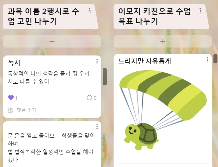 첫 활동으로 구글 이모지 키친을 활용해서 '작년 나의 수업과 올해 내가 바라는 수업'을 생각해 보는 시간을 가졌습니다. 작년 나의 모습과 새로운 나의 모습을 상징하는 두 개의 이모지를 선택하고 이 둘이 합쳐진 새로운 이모지에 제목을 붙이도록 했습니다. 이것을 동료에게 소개하면서 서로의 수업 목표를 공유하며 긍정적인 영향을 주고받을 수 있게 했지요. https://brunch.co.kr/@googeo4s5z/435