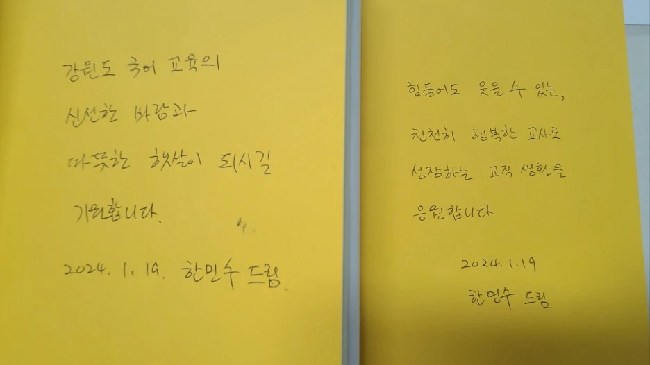 모둠별 교육과정 재구성 발표와 저의 '자유시 창작' 수업 사례 나눔을 끝으로 연수를 마쳤고, 가장 나이가 어린 선생님 4분에게 개인 저서인 <이번 생은 교사로 행복하게>를 선물로 드렸습니다. '강원 국어 교육의 꽃이 되길 바랍니다'와 같은 문구를 적어 드리면서 선생님의 밝은 미래를 응원했지요.