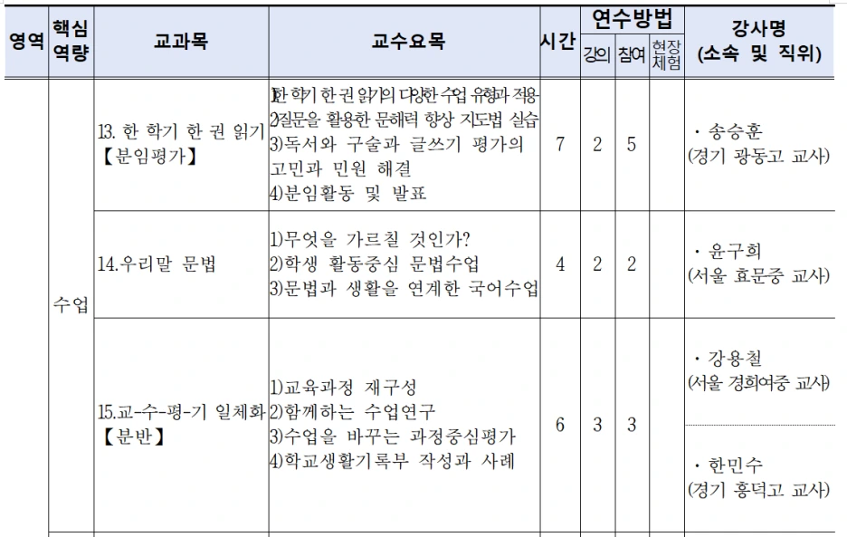또 자신이 가르친 과목 이름으로 2행시를 지어 발표하면서, 자연스럽게 수업 고민을 듣고 의견을 나눌 수 있는 시간도 가졌습니다. 이 활동은 아이들이 학년 초에 해도 좋다는 팁도 드렸어요. 수업에 거는 기대, 질문, 어려운 점 등을 2행시로 표현한 후 모둠별로 학생들이 이야기를 나누고 발표하면, 그것 자체로 경청과 존중이 있는 수업 만들기 위한 관계 맺기 활동이 될 수 있습니다.