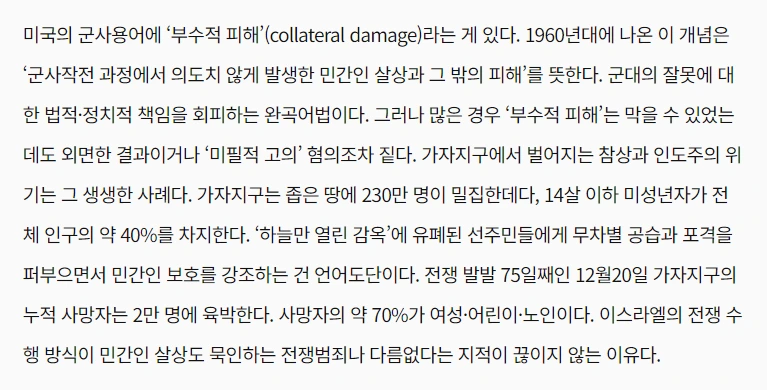 최근의 뉴스 중에서는 아래 링크에 있는 '정의·이성에 대한 믿음을 무너뜨린 이스라엘-하마스 전쟁'이란 제목의 글이 가장 인상적이었다. 특히 본문 중에서, 민간인 학살을 '부수적 피해'라는 군사 용어로 부르는 이들의 정신 상태와 의도를 아이들과 함께 분석해 보고 싶다. 그리고 며칠 전에 우크라이나군 포로를 실은 러시아군 수송기가 격추되어 추락한 사건도 무척 가슴이 아팠다. 고향으로 돌아가 가족을 만날 기대를 안고 비행기에 오른 65명의 우크라이나 병사는, 포로 교환을 목전에 두고 하늘의 별이 되었다.