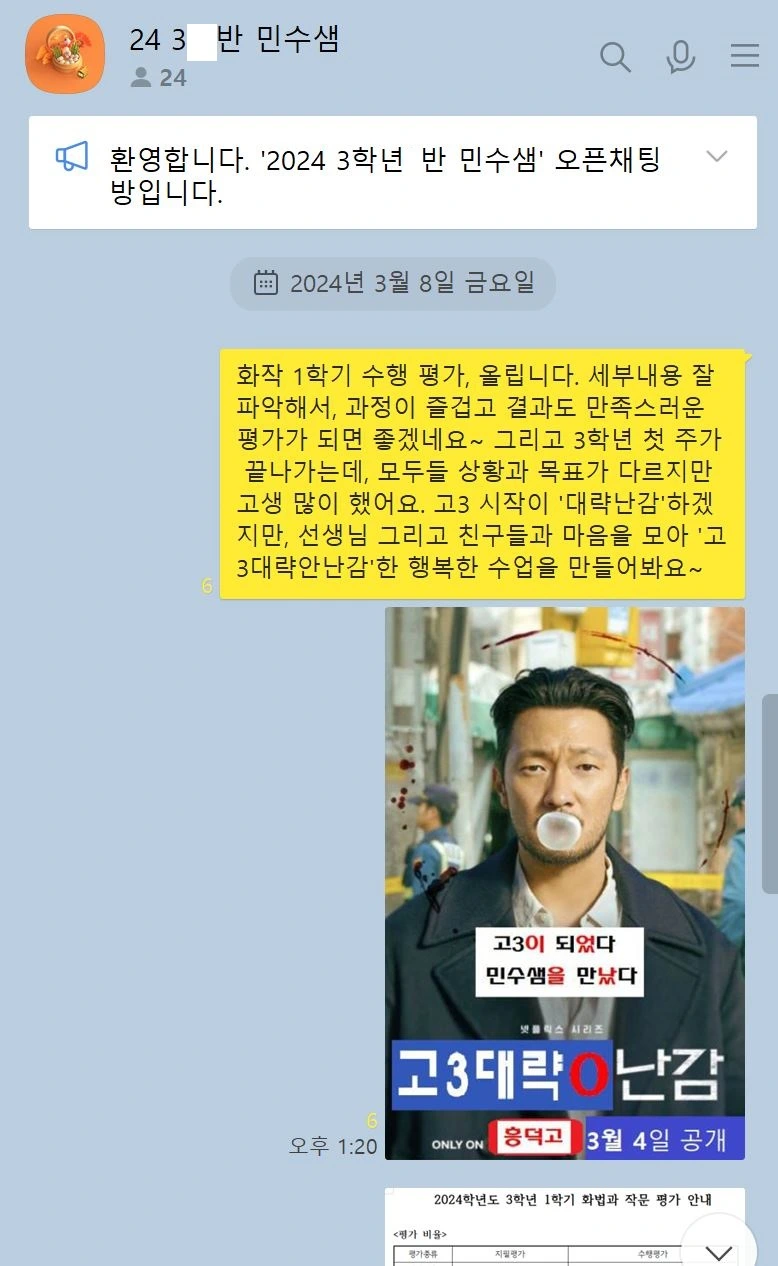 정신없이 수업하고, 학년 초 업무를 처리하니 드디어 금요일이라는 선물을 받았다. 몸은 힘들었지만, 새 학년 첫 주의 수업이 끝나서 너무너무 기분이 좋아진 나는 교무실로 와서 아래처럼 단톡방에 메시지를 날렸다. 방금 설명하고 온 수행평가 계획을 정리한 표와 함께, 그동안 아껴뒀던 드라마 포스터를 패러디한 사진도 올렸다.