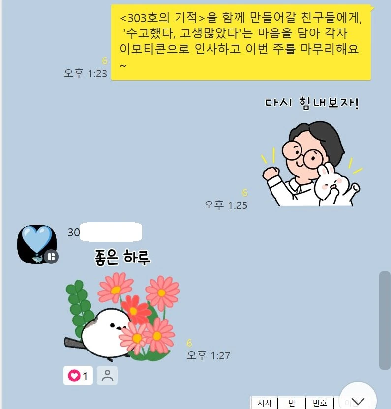 그리고 조금 욕심이 생겨서 "<303호의 기적>을 함께 만들어갈 친구들에게 '수고했다. 고생 많았다'라는 마음을 담아 각자 이모티콘으로 인사하고 이번 주를 마무리해요~"라는 글도 올렸다. 아이들이 첫날에 서로에게 첫인사를 하는 이모티콘을 날린 것처럼, 다른 이모티콘을 올려줄 것이라는 걸 기대하면서...