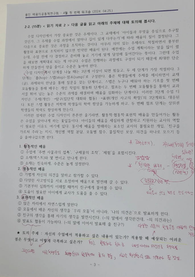 전개 단계인 스텝은 배움의공동체 수업 디자인의 원리인 '활동적, 협력적, 표현적 배움'에 관해서 정리해 놓은 글을 읽고 토의하는 시간이었다. '자신의 수업에서 적용하고 싶은 내용이 있는가? 적용할 때 예상되는 어려운 점은 무엇이고 어떻게 극복하고 싶은가?'를 주제로 25분 정도 대화를 나눴다.