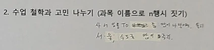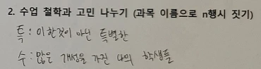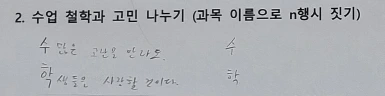 첫 시작은 자주 하는, '너의 이름은? n행시로 환대하기'로 열었다. 교생 선생님 포함 나까지 4명이라 한 글자씩 서로의 이름으로 3행시 짓기를 하며 함께 웃었고, 서로의 거리가 가까워졌다. 이어서 과목 이름으로 2행시 짓기를 했다. 수학, 특수, 사서 과목인 교생 선생님이 엄청 고민하며 창작해서, 살짝 당황스러웠지만 훈훈하게 마무리되었다. 나도 '교생'으로 2행시를 지어서 선생님들을 응원했다.