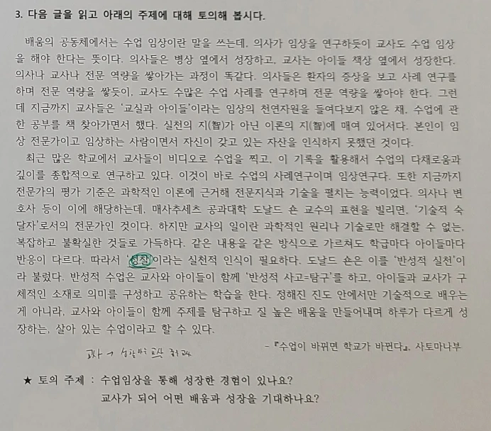 그렇게 만난 제자 겸 교생 선생님과 '교사의 성찰'에 대해 이야기할 수 있어서 기뻤다. 고3 수능 대비 수업을 하며 지쳐가던 나도 내 수업을 돌아볼 수 있었고 다시 도전할 수 있는 에너지를 얻었다. 나중에 어디서든 교사로 살며, 2024년 5월에 함께 읽은 이 문구가 든든한 버팀목이 되길 바란다.