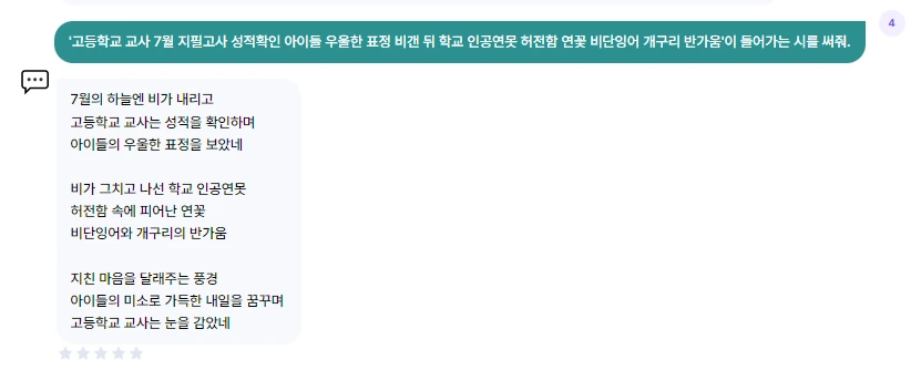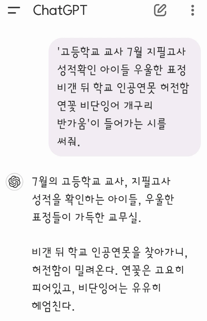 '고등학교 교사, 7월 지필고사 성적확인, 아이들의 우울한 표정, 비 갠 뒤 학교 인공 연못, 허전함, 연꽃 비단잉어 개구리, 반가움' 학교 안 연못을 보며 이런 생각을 하다가 들어와서 시를 써봤다. 그리고 호기심에 PC와 핸드폰 앱에 있는 ChatGPT에게도 같은 키워드를 주고 시를 써보게 했다.