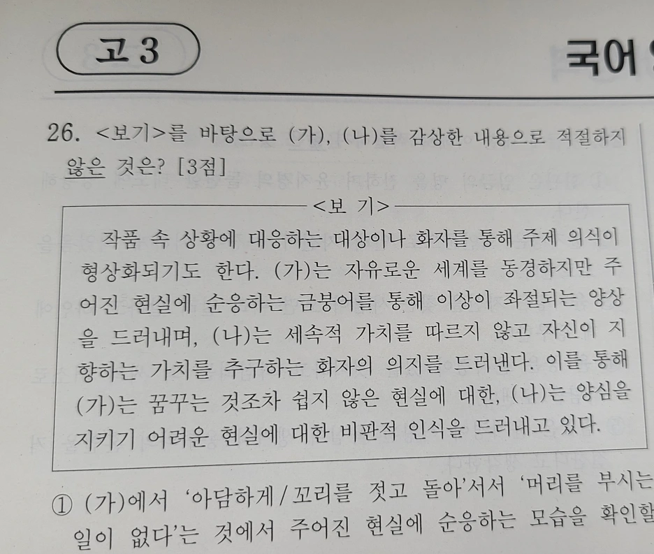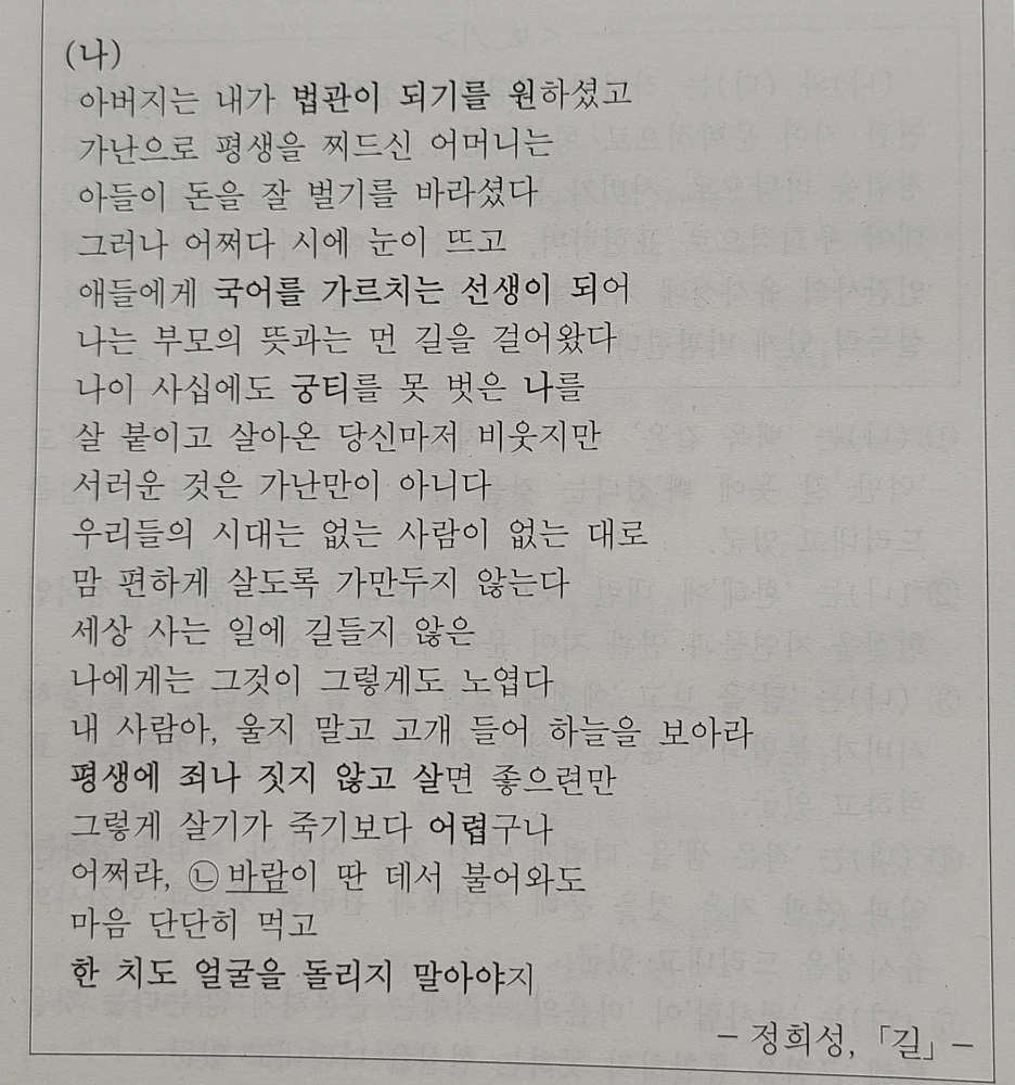 정희성의 <길> 역시 신의 계시처럼 주제가 주어져 있다. '세속적 가치를 따르지 않고 자신이 지향하는 가치를 추구하는 화자의 의지'가 주제 의식으로, '양심을 지키기 어려운 현실에 대한 비판적 인식'이 화자의 태도로 절댓값이 되었다. 이를 바탕으로 시어와 구절의 의미를 이해하는 능력을 평가하는 것이 목적이지만, <보기>가 있어서 주체적인 시 감상이 불가능하기 때문에 문제지에서 좋은 시를 ㅁ할 때마다 우울해진다.