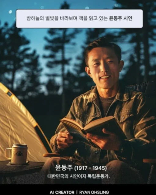 왜 윤동주 시인은 민족과 민중의 참혹한 현실을 외면할 수 없었을까? 답이 명확한 이런 질문을 떠올리는 것 자체가 부끄러운 2024년의 8.15 광복절을 보내며, 그래도 힘을 주었던 것은 독립운동가들의 환한 웃음이었다. AI 기술로 만든 사진과 영상이지만, 많은 분들이 그랬던 것처럼 나도 여러 번 돌려보며 웃다가 울다가 했다. 더 찾아보니 윤동주 시인이 활짝 웃는 얼굴도 있었고, 유관순 열사가 18살로 환생해 친구와 떡볶이를 먹는 사진도 있어서 뭉클했다.