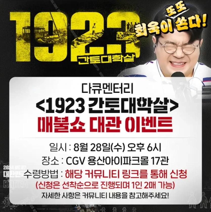 얼마 전에는 유튜브 시사 프로그램인 '매불쇼'에서 다큐멘터리 <1923 간토 대학살>을 알게 되었다. 진행자인 최욱 MC가 패널들의 강요(?)로 영화관 대관까지 하면서 후원하는 모습을 흐뭇하게 지켜보았다.