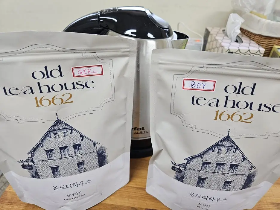 그래서 학교에서 수업이 끝나고 몇 모금씩 마시던 물 대신 눈에 좋은 '결명자차'를 마시게 되었다. 다른 전통차에도 관심이 생겨서 아침에는 혈관과 항산화에 좋은 보이차를 모닝커피 대신에 마시고 있다. 두 개를 쉽게 구별하기 위해, 보이차는 원음(?) 그대로 'BOY'를, 결명자차에는 비슷한 음인 'GIRL'을 스티커로 붙여놓으니 둘이서 썸타는 것 같아 보기 좋다. ㅎㅎ