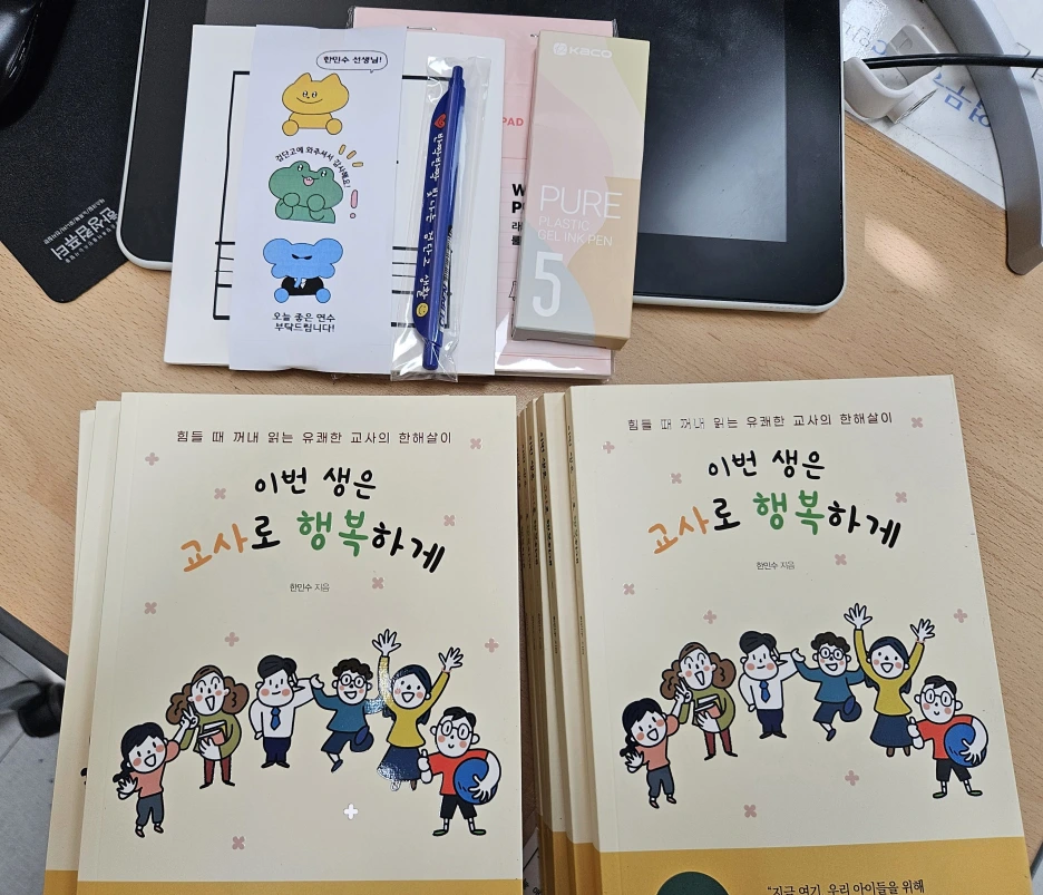 교직에 들어와서도 선생님들에게 과분한 사랑을 받은 순간이 참 많았다. 나를 초대해 준 선생님이 흰 때밀이 수건을 수줍게 건네던 순간에도 동료애를 넘어 동포애, 인류애까지 느꼈다. 선물은 그게 전부가 아니었다. 볼펜 세트와 작은 노트, 그리고 내가 쓴 책도 연수에 참여한 선생님 숫자만큼 미리 구입해서 소박한 사인회까지 열 수 있게 해주셨다.