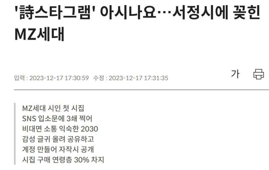 2019년 이후 시집 판매량이 증가하고 있다. 구매자의 30%가 2·30대이고, 이들은 인스타그램에 마음에 드는 시를 써서 올리거나 공유하고, 시집을 추천하기도 한다. 그런고로 나도 시스타그램을 하기로 했다. 학교에서 맨날 20세기의 시만 읽고 가르치니 현대시의 고인물이 되었는데, 수문을 열어서 21세기의 시가 흐른다면 더 상쾌해질 것 같고 수업에 활용할 수도 있다.
