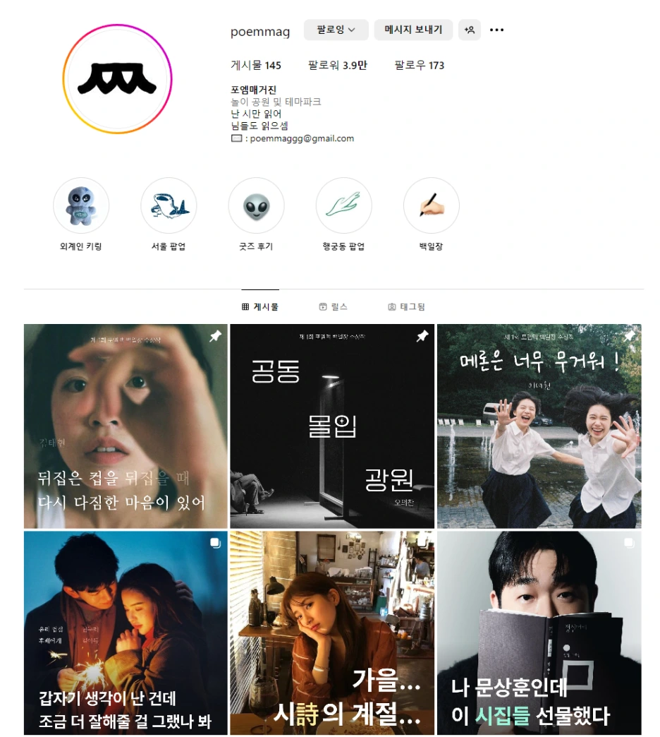 그리고 시스타그램에 동참하기 위해 기사에 본 '포엠매거진'을 팔로우했다. 거기에 올라온 게시물과 릴스, 스토리까지 구경하니 '신대륙 발견'이었다. 요즘 아이들이 왜 인스타에 빠지는지 알겠다. 스레드엔 지인도 아닌데 어떤 분이 바로 나를 팔로우했다. 기뻤다. ㅎㅎ