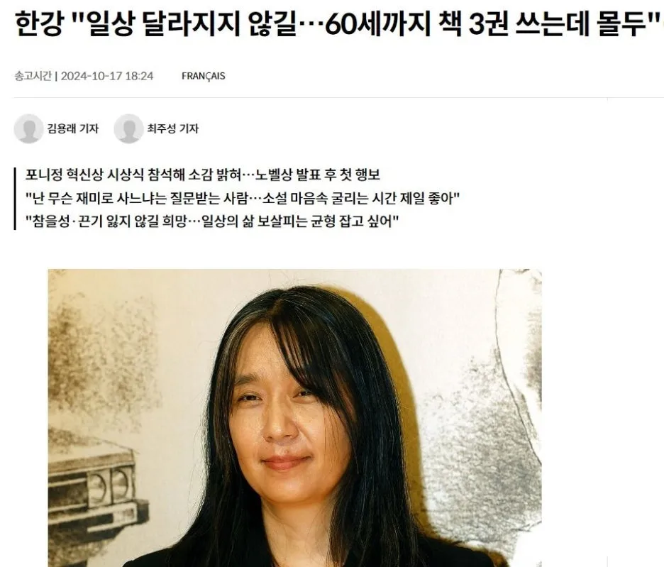 요즘 저의 사는 재미는 모두 한강에서 나와 한강으로 흐릅니다. 학교와 집에서 한강 작가의 소설을 읽고 있고, 한강 작가가 나오는 유튜브 영상을 보고, 관련 기사나 SNS 글을 계속 읽어도 질리지 않습니다. 한강 작가가 전해준 문학에 대한 열정이 마음속에서 조금씩 연기를 피우고 있음을 느낍니다. 한강 작가는 '70세, 80세까지 현역으로 활동하는 작가들도 있지만 그것은 여러모로 행운이 따라야 하는 일'이라고 말했습니다. 저는 이미 '한강 작가의 노벨 문학상 수상'이라는 강력한 행운을 하나 얻었습니다.