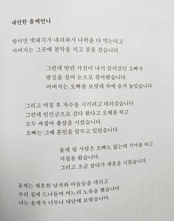 "반란 사건이 나서 끌려갔던 오빠가 밤길을 걸어 논으로 찾아왔습니다. 아버지는 오빠를 보릿대 속에 숨겨 놓았습니다. 그리고 며칠 후 자수를 시키려고 데려갔습니다. 그런데 인민군으로 갔다 왔다고 오해를 하고 모두 싸잡아 총살을 시켰습니다. 오빠는 그때 혼인을 앞두고 있었습니다. 올케 될 사람은 오빠도 없는데 가마를 타고 시집을 왔습니다. 그리고 조금 살다가 재혼을 시켰습니다. 올케는 재혼한 남자와 아들들을 데리고 우리 집에 드나들며 며느리 노릇을 했습니다. 나는 올케가 너무나 대단해 보였습니다."