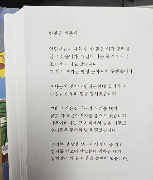 "반란군 때문에 인민군들이 나와 한 살 많은 여자 조카를 끌고 갔습니다. 그런데 나는 돌려보내고 조카만 데리고 갔습니다. 그 뒤로 조카는 영영 돌아오지 못했습니다. 오빠들이 넷이나 반란군한테 끌려가고 순경들은 우리 집을 감시했습니다. 그리고 작은집 식구와 우리를 냇가로 끌고 가 작은아버지를 총으로 쐈습니다. 작은아버지는 그 자리에서 숨을 거두고 우리들은 무서워 벌벌 떨었습니다. 우리는 몇 달을 냇가에서 천막을 치고 감시를 받으며 살았는데 엄마는 내가 잡혀갈까 봐 늘 마음을 졸여야 했습니다."