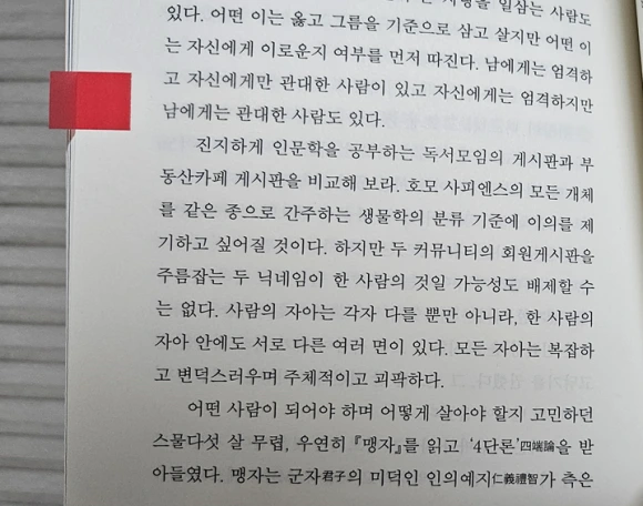 - 유시민의 <문과 남자의 과학 공부>의 '나는 무엇인가'에 관한 부분을 읽다가 전두엽을 쿵 울리는 배움이 있었다. 인문학 독서모임과 부동산 공부모임에 관한 작가의 통찰이 놀라웠다. 독서모임을 이끌고 있다는 자부심으로, 재테크에만 열중하는 사람들에 대해 정신 승리를 해왔던 과거를 반성하게 되었다. 민주주의만큼 인간에 관한 공부도 어렵고 소중하다는 것을 느꼈다.