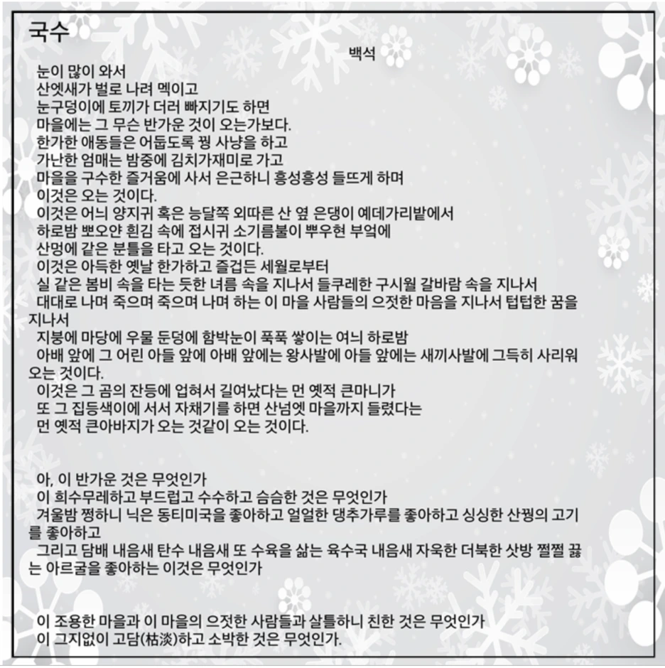- 내일은 2025년을 다시 시작하는 설날. 창밖의 함박눈을 보고 있으니까 백석의 <국수>가 떠올라서 시를 써봤다. '대대로 나며 죽으며 죽으며 나며 하는 이 마을 사람들의 의젓한 마음'을 그리워했던 1941년 백석 시인의 심정이 짐작되어 슬펐다. 하지만 식민지 시대 만주를 떠돌던 백석은 고향의 모습 속에서 늠름하고 듬직한 우리 민족의 기상도 발견했다. 흰 국수처럼 부드럽고 수수하지만, 어려움을 이겨내는 강인한 공동체 정신도 지닌 우리 한민족! 뜨끈한 국물 속에서 국수 가락이 풀리듯, 지금의 정치적 위기도 술술 풀려가길 조상님께라도 빌어 본다.