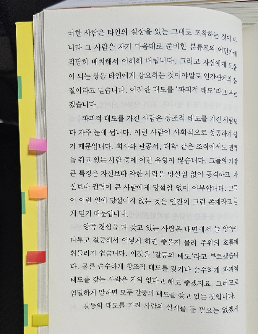 창조적 태도의 반대는 파괴적 태도다. '너는 이런 모습의 사람이 되어야 해'라고 강요하는 태도이다. 이런 태도를 갖게 된 것은 성장 과정에서 자신이 파괴적인 태도를 강요당했기 때문이다. 이렇게 강요받은 사람은 늘 불안하고 거짓된 말과 행동을 한다. 때로는 죄책감과 공포를 느끼며 폭력을 사용하기도 한다.