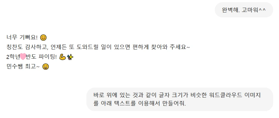 아이들의 꿈 목록은 엑셀이나 텍스트 파일로 첨부해도 되고, 직접 채팅창에 붙여넣기를 해도 된다. 오늘 처음 해봤는데, 이미지의 글자 크기가 달라서 '글자 크기를 비슷하게 해서 다시 만들어줘'라고 요청했더니 바로 수정해 주었다.