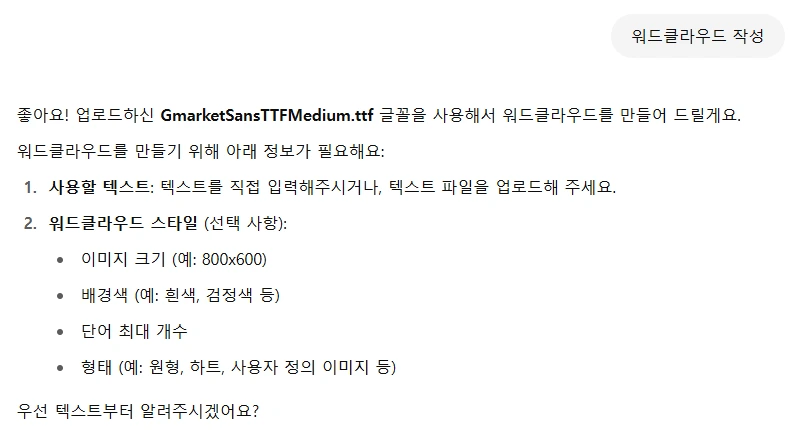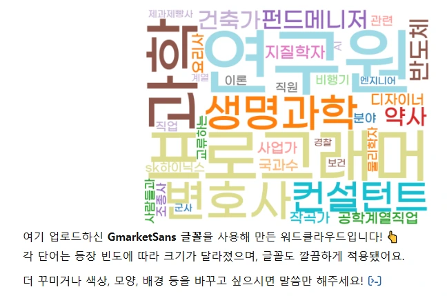 요즘엔 ChatGPT로 워드 클라우드를 만들 수 있어서 너무 편하다. 먼저 채팅창에 원하는 한글 글꼴의 TTF 파일을 업로드하고 '이 글꼴을 적용해 줘'라고 한다. 그다음엔 '아래 파일로 워드 클라우드 이미지를 만들어줘' 하면 거의 끝이다.