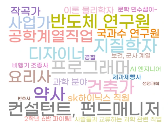이를 위해서 3월 초에 받아 놓은 온라인 설문지 중에서 아이들이 직접 적은 '장래 희망, 관심 있는 분야'의 단어들로 워드 클라우드를 만들었다. (예전에는 컬러 A4 지에 아이들의 꿈을 출력해서 예쁘게 자른 후 교실 뒤에 모두 붙여 놓기도 했었다는...)