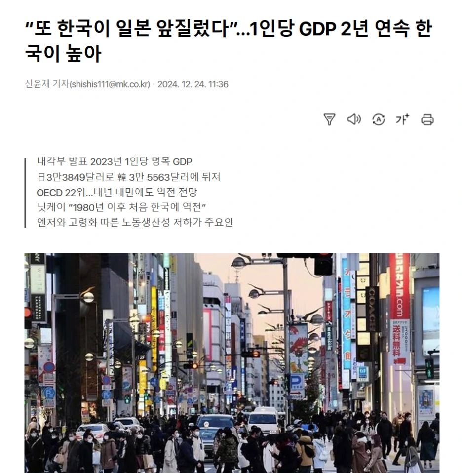 2025년, 2년 연속으로 한국 1인당 GDP가 일본을 앞섰다. 과거에 식민 지배를 당했던 나라가, 그 식민 지배국을 국민소득에서 앞선 사례는 영국을 추월한 아일랜드 정도. 확실한 역전으로 격차를 더 벌려 가면 기분은 좋겠지.