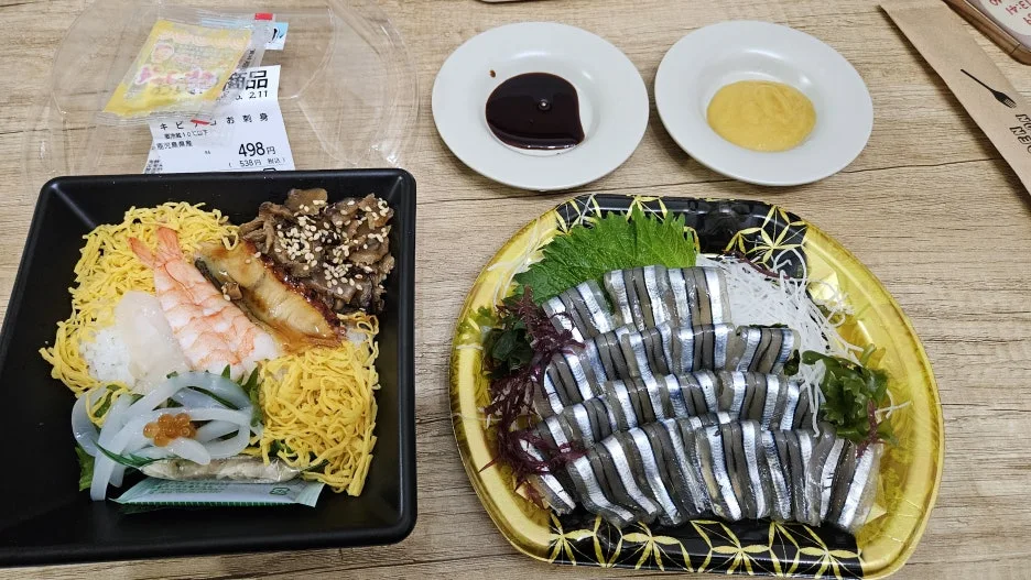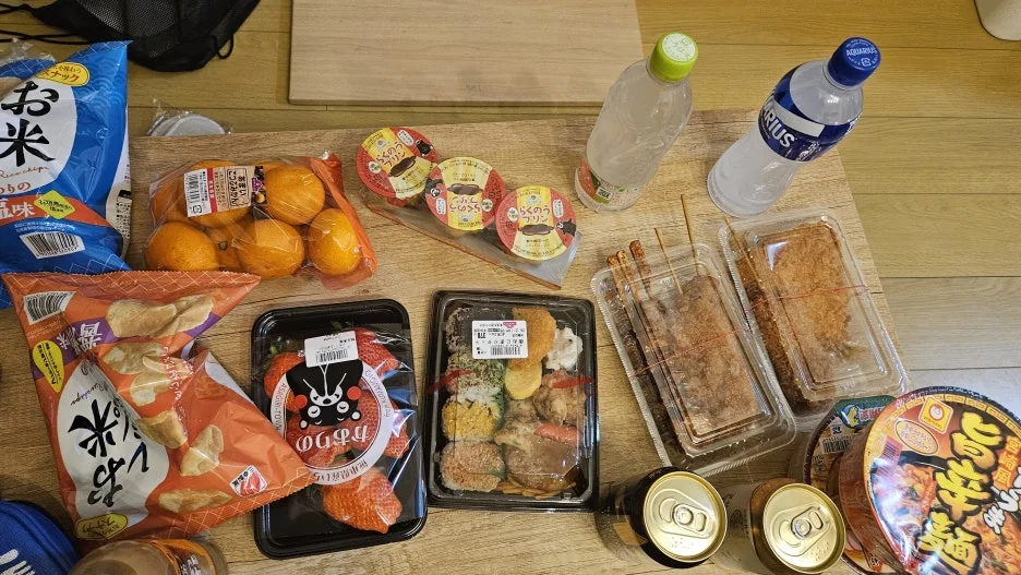 사쿠라지마에서 숙소로 돌아올 때, 마트에서 먹거리를 사 왔다. 유럽에 가더라도 관광객이 없는 로컬 시장에 꼭 가고 싶은데, 일본에는 마트나 편의점에서 살 수 있는 저렴한 도시락, 신선 식품이 많아서 구경하고 먹는 재미가 쏠쏠했다. 미슐랭 맛집의 코스 요리도 좋지만, 마트 진열대에서 최선의 도시락을 낙점하는 이 '소박하고도 치열한 눈치 싸움'이 재미있다. 여행에서 놓치고 싶지 않은 사람 냄새 나는 묘미다.