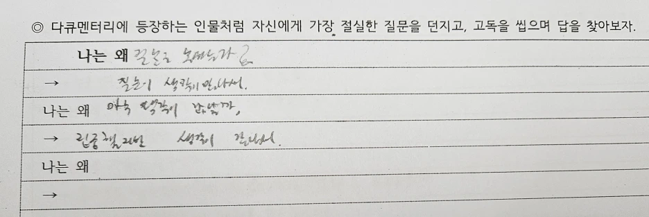 고등학교 1학년 첫 수행평가인 수필 쓰기는 '나는 누구인가'와 '내가 사랑하는 생활'을 주제로 한 글쓰기 수업을 하나로 묶어서 5차시로 기획했다. 첫 시간에는 다큐멘터리 <검색 말고 사색, 고독 연습>을 보고 등장인물처럼 자신에게 가장 절실한 질문을 던지며 답을 찾아가는 활동을 했다. '나는 누구인가'를 찾기 위해 질문을 던지고, 그 답을 다시 질문으로 이어가며 내면의 자아와 만나는 것이다. '와이 카드(Why Card)'라고 불리는 활동은 내가 진정으로 원하는 것, 그리고 나에게 가장 필요한 목표와 성찰 지점을 찾는 데 의의가 있다.