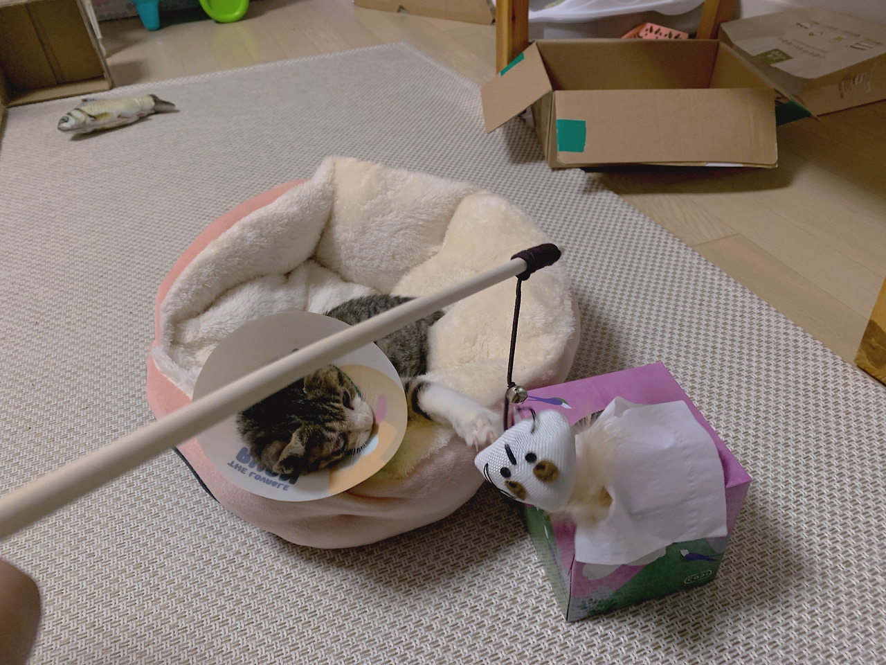 구슬이가 우리 집에 처음 온 뒤, 나는 온라인을 통해 사냥놀이 몇 가지를 주문했다. 하지만 너무 어렸던 구슬이는 사냥놀이 장난감을 오히려 무서워하는 기이한 현상이 벌어졌다. 눈도 아프고, 기력도 없었으니 아마 더 그랬을 것이다. 그리고 그 뒤 며칠은 움직이는 사냥놀이 장난감에는 반응하지 않고, 오히려 땅에 떨어진 사냥놀이 장난감만 가지고 마치 자신이 수확한 것인 양 그것을 물어뜯었다. 하지만 바로 넥카라를 착용한 구슬이는 다시 활동성이 떨어졌고, 사냥이라는 항목에 있어서는 과연 구슬이가 고양이인가에 대한 의문이 들 정도로 사냥에 관심이 없었다. 주는 먹이는 누구보다 열심히 먹으면서도, 사냥은 하지 않는 동물원 우리의 사자 같은 모습이었던 것이다.