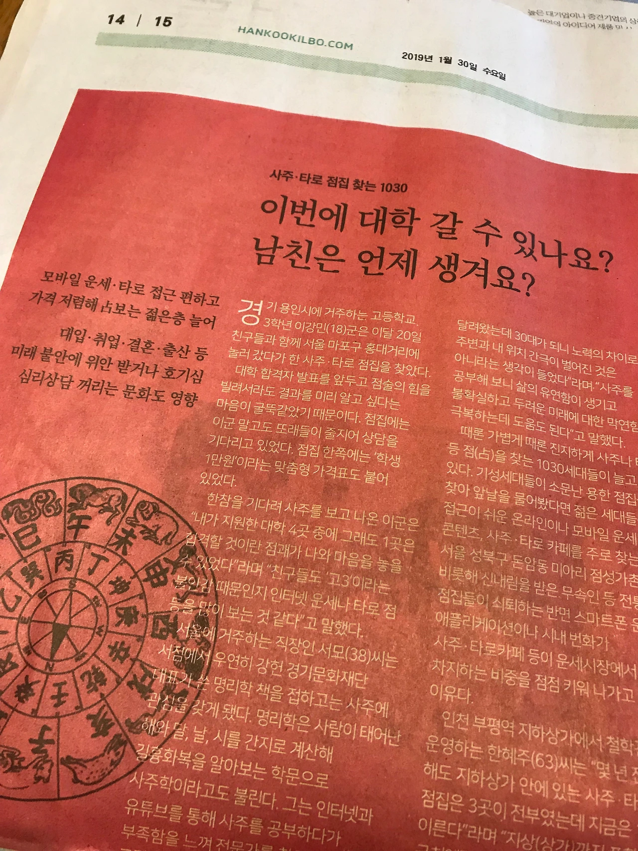 내가 다녀온 역술집들을 오래 기억하고 싶어서 이 글을 쓰는 건 아니다. 내가 본 사주의 기억은 내 불안의 기억이다. 일 년간 약 40만 원 가까운 돈을 사주에 썼다. 심장이 두근거리고 잠이 안 오는 날이 길어질 때마다 2, 3만 원 씩을 이런 과학적이지 않은 방식*으로 불안을 달래는 데 썼다. 나만 그런 게 아니었다. 함께 공부하는 친구들 모두 사주에 미쳐있었다. 더러는 직접 공부를 하기도 했다. 자신의 우울한 현실에 아주 답이 없는 것은 아닐 거라고 희망을 가지며, 그렇게 내일을 읽어내려고 했다. 모두가 그랬다. 함께 사주에 미쳐있던 친구가 어느 날 기사 하나를 보내왔다.