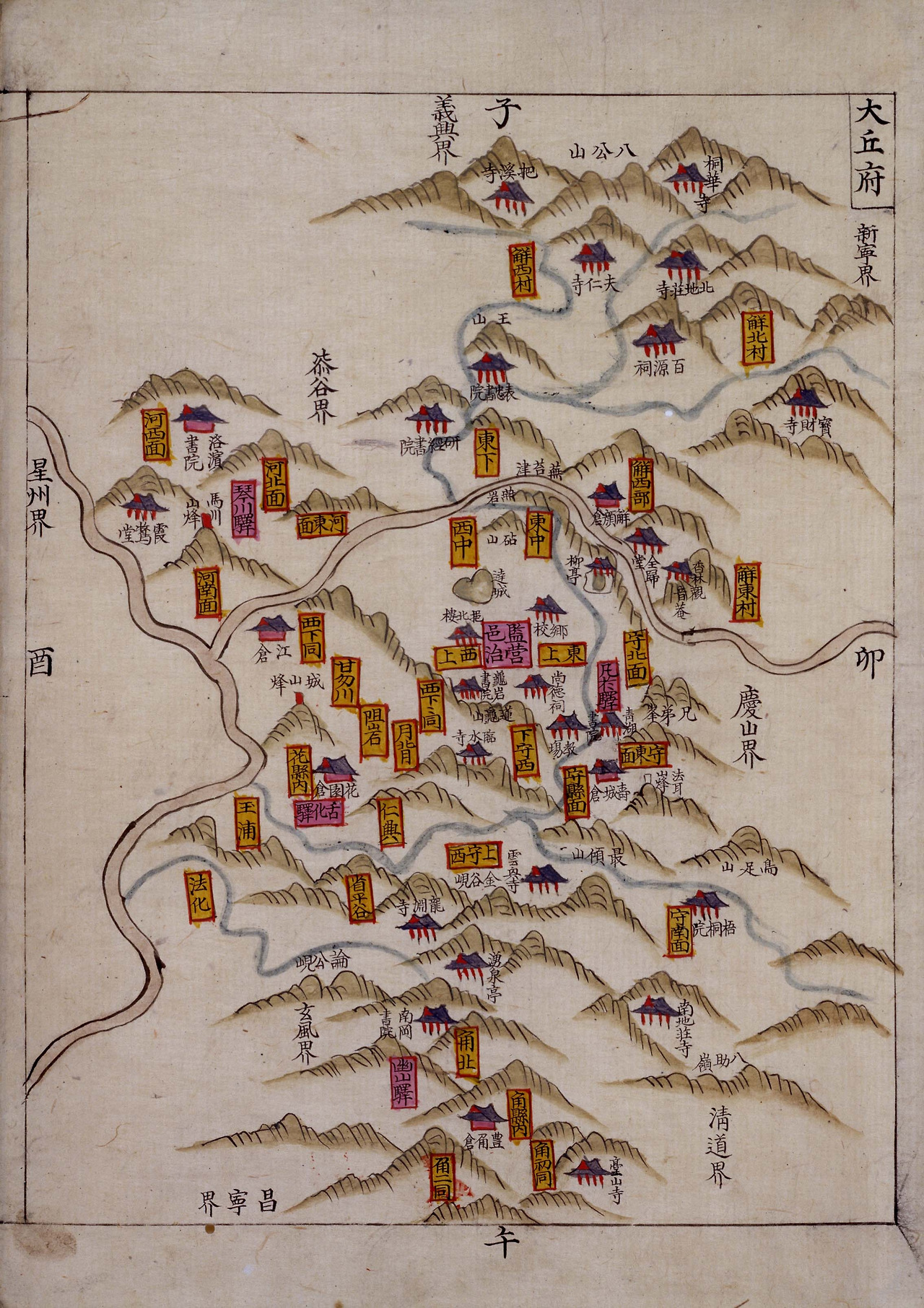 달성아래 경상감영이 보이고 읍치는 생략되어 있다. 서쪽 끝에는 2호선 강창역의 조운창이 표기되어 있고