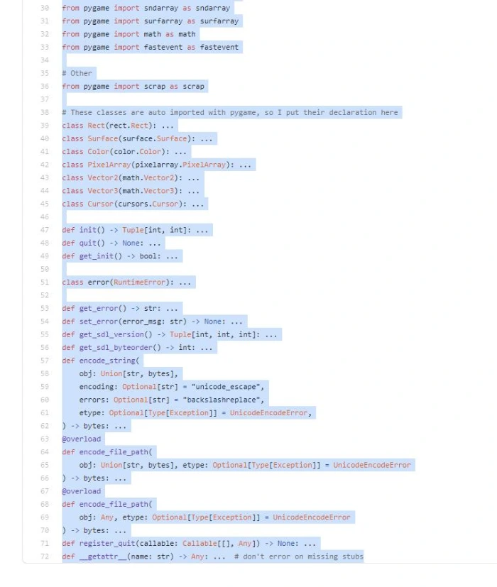 https://github.com/pygame/pygame/blob/main/buildconfig/pygame-stubs/__init__.pyi